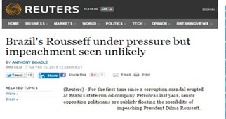Dilma “não encara um risco imediato de impeachment”, diz a reportagem, que completa alegando que isso pode mudar se houve provas de envolvimento dela na corrupção da Petrobras. Segundo a Reuters, protestos pedindo nas ruas a derrubada da presidente “reuniram poucas centenas de pessoas e líderes da oposição tomaram cuidado para se distanciar”.