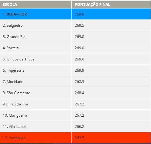 A Viradouro, que abriu o Carnaval e teve a atriz Juliana Paes na comissão de frente, ficou em último lugar e foi rebaixada para a Série A.