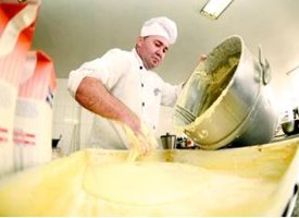 A mistura dos ingredientes, numa batedeira de concreto, leva menos de 10 minutos e enche aproximadamente três tabuleiros. Cada fornada produz 34 bolos por hora. “É uma super produção”, apontou o chef Adelmo.
