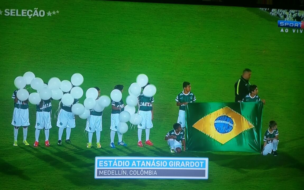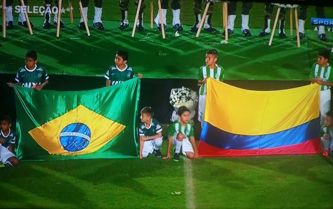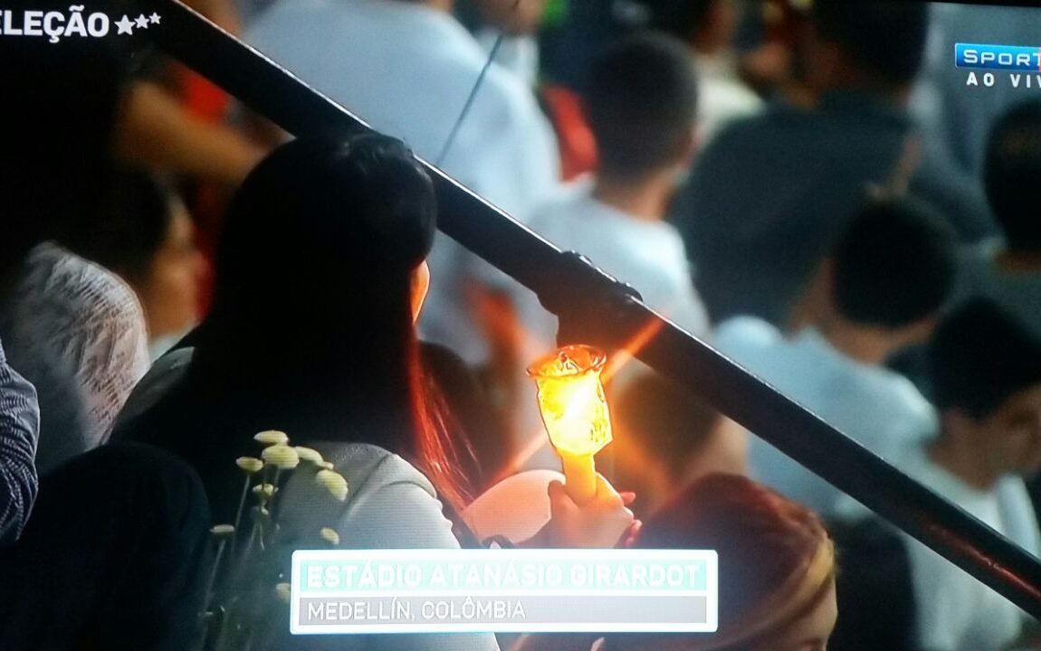 Às 21h45 (de Brasília) em ponto, a Arená Condá e o Atanasio Girardot mergulharam em silêncio. Na Colômbia, os torcedores carregavam velas acesas nas mãos, quase todos vestidos de branco. No Brasil, bandeiras e faixas cobriam a arquibancada. Durante um minuto, em respeito aos mortos, não se ouviu nem um piu nos dois estádios. Na sequência, em Chapecó, teve início uma salva de palmas, enquanto no telão da Condá passavam fotos e os nomes dos vitimados no acidente.