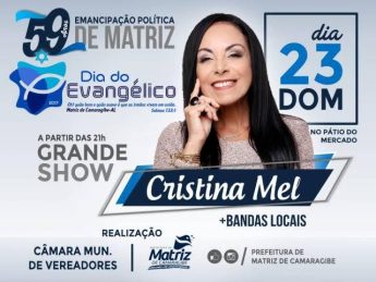 No domingo, a cidade de Matriz comemora o Dia do Evangélico, cuja cantora gospel de renome nacional, Cristina Mel, é quem se apresentará num grande show musical, evento que também contará com a presença de bandas locais e artistas da região.