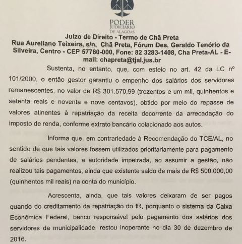 “Estamos desde o começo do ano, brigando para que a prefeita pague a folha de salário dos aposentados referente ao mês de dezembro de 2016, até porque o gestor passado deixou em caixa cerca de 500 mil reais; desses 300 mil seriam justamente para a folha em aberta, conforme documentos em anexos” diz Canuto, afirmando que esse caso virou uma verdadeira polêmica na cidade, visto que a prefeita segundo ele, teve a ousadia de entrar  na Justiça, para desfazer uma medida tomada em fevereiro pela juíza de Viçosa, que teria bloqueado os recursos, a fim de que esses fossem para pagar dentro de cinco dias os aposentados. “A prefeita recorreu da decisão ao Tribunal de Justiça” afirma o parlamentar.