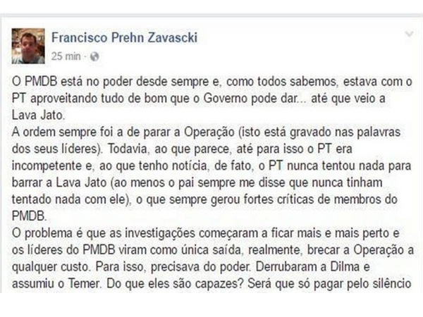 Francisco Zavascki, filho do ministro Teori Zavascki, do Supremo Tribunal Federal, morto em janeiro num acidente aéreo, publicou um desabafo em seu perfil no Facebook, na noite de quarta-feira, depois que foram divulgadas informações sobre as delações do empresário Joesley Batista, dono da JBS. Em sua postagem, Francisco pediu o impeachment do presidente Michel Temer e destacou: “não tenho como não pensar que não mandaram matar o meu pai!”.