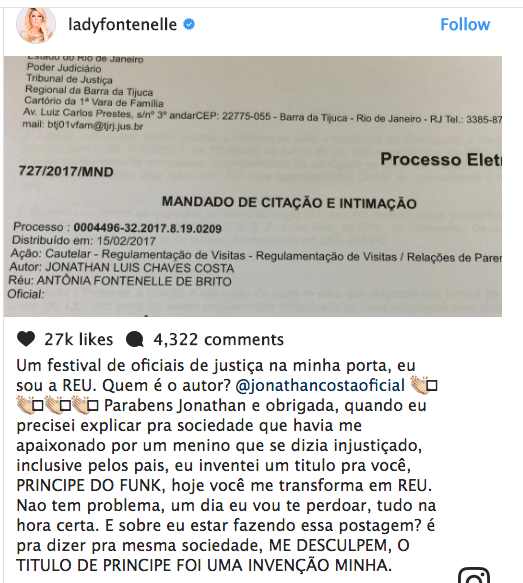 — Um festival de oficiais de justiça na minha porta, eu sou a REU. Quem é o autor? @jonathancostaoficial. Parabens Jonathan e obrigada, quando eu precisei explicar pra sociedade que havia me apaixonado por um menino que se dizia injustiçado, inclusive pelos pais, eu inventei um titulo pra você, PRINCIPE DO FUNK, hoje você me transforma em REU. Nao tem problema, um dia eu vou te perdoar, tudo na hora certa. E sobre eu estar fazendo essa postagem? é pra dizer pra mesma sociedade, ME DESCULPEM, O TITULO DE PRINCIPE FOI UMA INVENÇÃO MINHA.