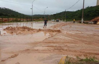 A via foi implantada no fundo de um vale, local de escoamento natural das águas de chuva, por isso ela fica inundada.