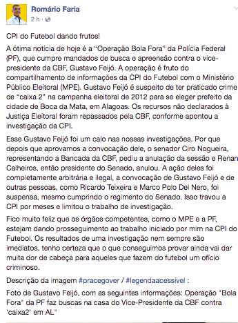 O senador Romário Faria autor das denúncias contra o vice-presidente da CBF, Gustavo Feijó, comentou em sua fanpage na redes sociais a operação Bola Fora desencadeada em Alagoas pela PF na manhã desta sexta-feira (09).