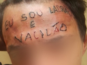 Além de ter a testa marcada com uma tatuagem, o adolescente revelou que teve o cabelo cortado e teve os pés e as mãos amarrados por Ronildo e Maycon. “Eu comecei a puxar o cabelo para a frente para tentar esconder e eles então cortaram meu cabelo.”