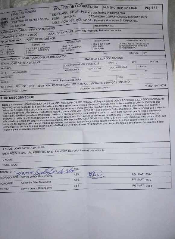 A UPA ainda informa que o pai da criança, o senhor João Rodrigues, esteve na Unidade e confirmou que a criança já chegou em óbito na UPA e que receberam o devido atendimento médico, tanto da equipe de enfermagem quanto da parte médica.”