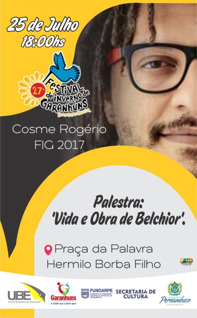 Em entrevista ao Estadão Alagoas, Cosme Rogério explicou que os objetos de suas pesquisas em sociologia são o campo literário brasileiro e o mercado de bens simbólicos. “Minha relação específica com a obra de Belchior é afetiva (uma das trilhas sonoras de minha juventude), e, na palestra, abordarei a sua produção do ponto de vista sociológico, analisando a relação do artista com o campo da arte no brasil. ApresentareI também uma performance poético-musical interpretando algumas de suas composições para ilustrar o diálogo entre ficção e realidade presente na crônica musical do cantor.