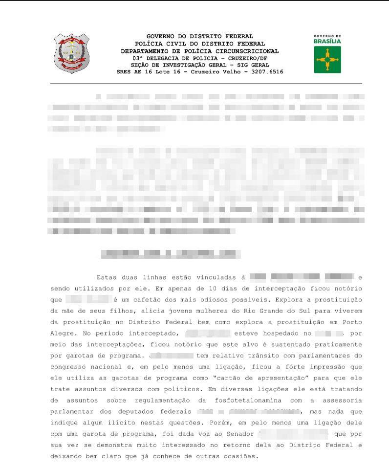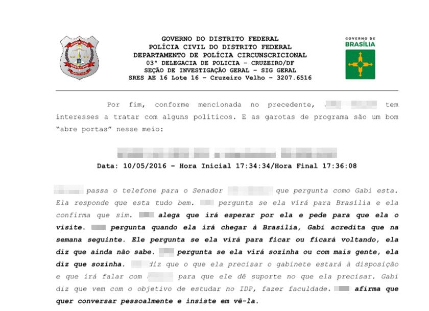 A apuração conta com dezenas de horas de gravações feitas com autorização judicial e investiga a conexão entre agenciadores do DF e do Sul do país. O cafetão, de Porto Alegre, costuma utilizar as garotas de programa como uma espécie de “cartão de visita” para se aproximar dos políticos.