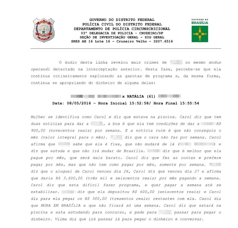 Pelo menos três vítimas da rede de prostituição chegaram a registrar ocorrência na 3ª DP dos golpes praticados pela cafetina, que não devolveu as quantias pagas pelas garotas. Uma delas chegou a detalhar aos policiais como funcionava o esquema de aliciamento no Rio Grande do Sul e como ocorre a exploração sexual nas cidades do DF.