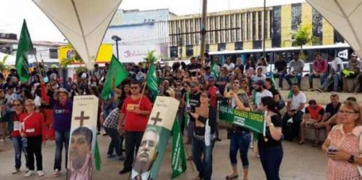 Em greve a exatos 91 dias, trabalhadores em educação da rede pública municipal de Arapiraca, organizados pelo Sinteal, realizaram, na manhã desta quarta-feira (09/08), o “enterro simbólico” da administração do prefeito Rogério Teófilo (PSDB) e do secretário de Planejamento e Gestão, Antônio Lenine Pereira.