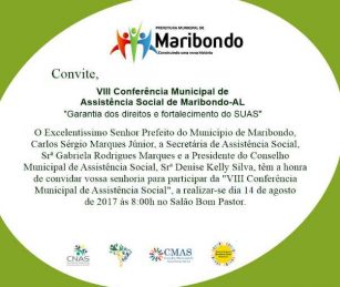 A Secretaria Municipal de Assistência Social de Maribondo em parceria com o Conselho Municipal de Assistência Social, realizará nesta segunda-feira (14), a 8ª Conferência Municipal de Assistência Social com o tema “Garantias dos Direitos e fortalecimento do SUAS”. O objetivo central é analisar, avaliar e deliberar as diretrizes para o financiamento e a gestão com vistas ao aprimoramento do Sistema Único de Assistência Social (SUAS).