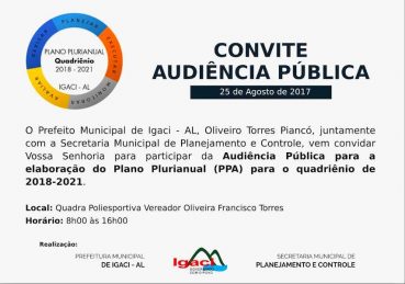 Com foco em todos os setores e serviços prestados no município e visando melhorar a qualidade de vida da população, a Prefeitura de Igaci por intermédio da Secretaria de Planejamento, realizará na próxima sexta-feira (25) – uma audiência pública objetivando a elaboração do Plano Plurianual (PPA) para o período 2018-2021.