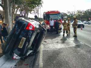 O acidente envolvendo dois carros aconteceu por volta das 8h10 na altura da 111 Sul, no Eixão, sentido Rodoviária-Aeroporto. Um dos veículos subiu no gramado lateral da pista. O motorista, de 28 anos, não ficou ferido.