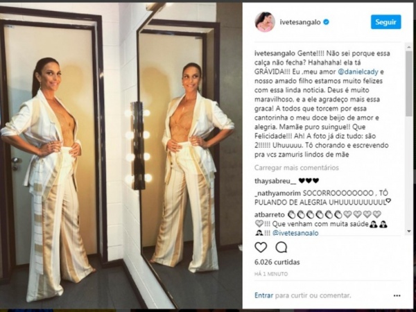 “Gente!!!! Não sei porque essa calça não fecha? Hahahaha! ela tá GRÁVIDA!!! Eu, meu amor @danielcady e nosso amado filho estamos muito felizes com essa linda noticia. Deus é muito maravilhoso, e a ele agradeço mais essa graca! A todos que torcem por essa cantorinha o meu doce beijo de amor e alegria. Mamãe puro suingue!! Que Felicidade!!! Ah! A foto já diz tudo: são 2!!!!!! Uhuuuuu. Tô chorando e escrevendo pra vcs”.