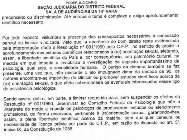 “O Judiciário se equivoca, neste caso, ao desconsiderar a diretriz ética que embasa a resolução, que é reconhecer como legítimas as orientações sexuais não heteronormativas, sem as criminalizar ou patologizar. A decisão do juiz, valendo-se dos manuais psiquiátricos, reintroduz a perspectiva patologizante, ferindo o cerne da Resolução 01/99”.