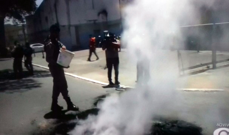Policial apaga fogo em corredor de ônibus no centro de Maceió (Foto: Reprodução / TV Gazeta)
