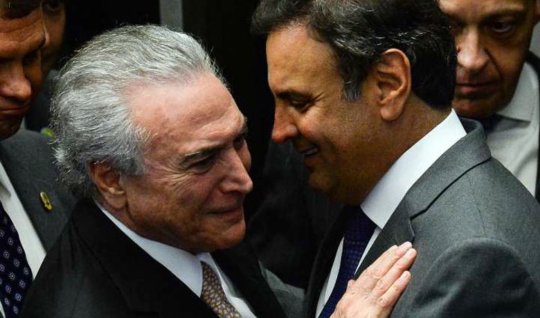 (© AFP) Presidente da República Michel Temer cumprimenta senador Aécio Neves após cerimônia de posse em Brasília – 31/08/2016