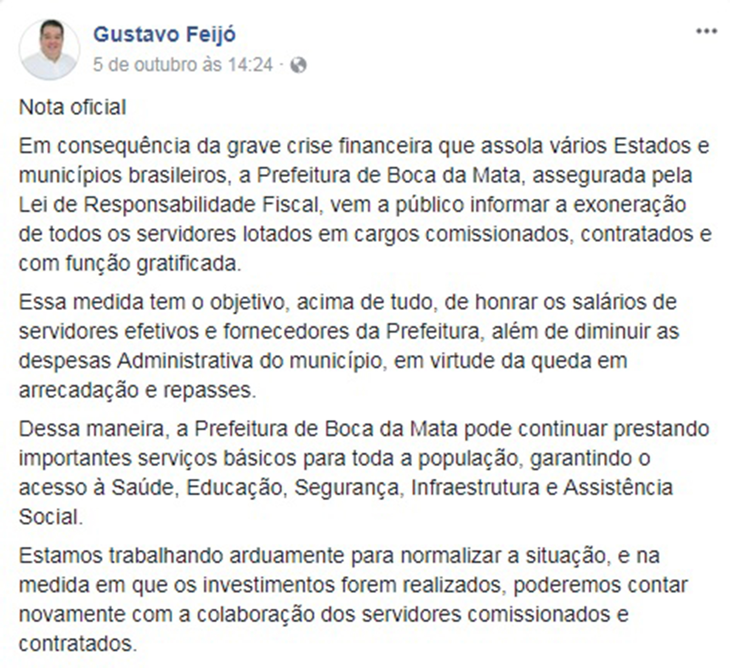 Mais um prefeito de Alagoas exonerou os servidores lotados em cargos comissionados, contratados e com função gratificada. O gestor da cidade de Boca da Mata, Gustavo Feijó, utilizou as redes sociais na quinta-feira (05) e anunciou a decisão.
