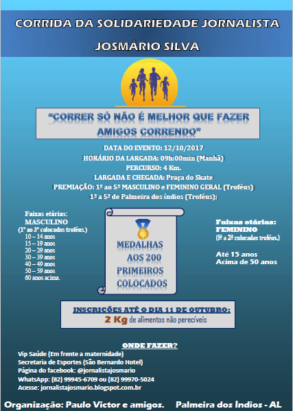 Nesta quinta-feira (12), acontece na cidade de Palmeira dos Índios a “I CORRIDA DA SOLIDARIEDADE JORNALISTA JOSMÁRIO SILVA”, além de uma visível homenagem ao grande eminente jornalista.