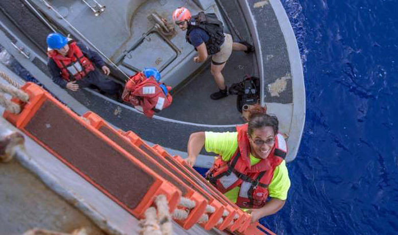 O barco da Marinha dos EUA, o USS Ashland, estava na área e chegou no dia seguinte para resgatar as velejadoras – ambas de Honolulu – e seus cachorros.