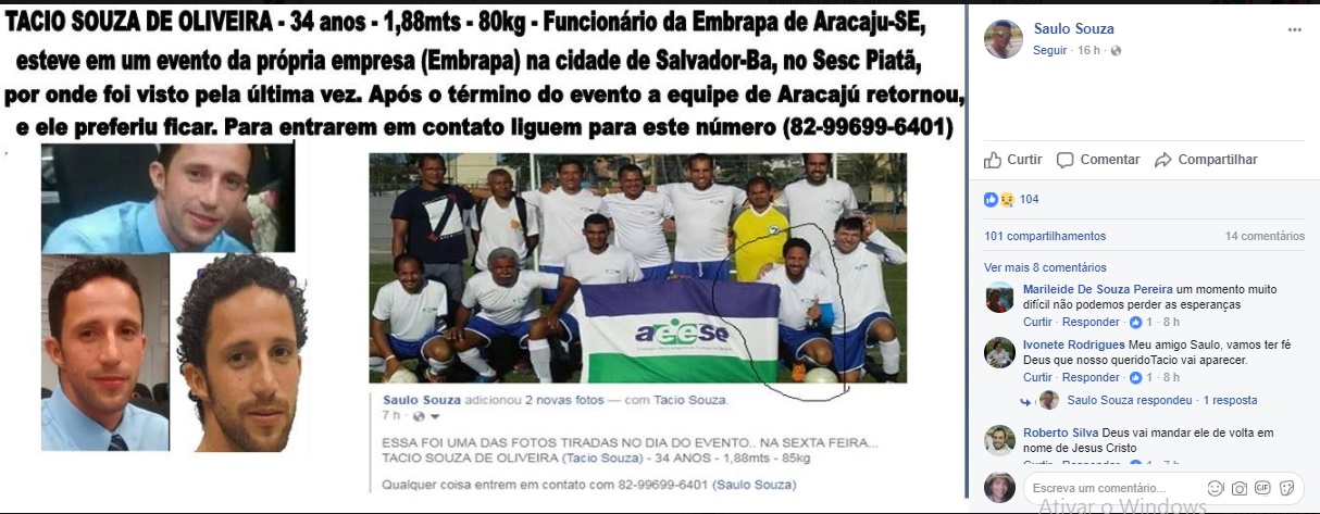 Segundo informações, ele atualmente residia em Aracaju e teria ido com uma equipe da Embrapa participar de um evento no Sesc Piatã em Salvador, onde foi visto pela última vez pelos colegas de trabalho.