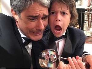 William Bonner não levou o troféu Melhores do Ano, do “Domingão do Faustão” – a melhor jornalista de 2017, segundo votação popular, foi Sandra Annenberg -, mas não perdeu o bom humor. O âncora do “Jornal Nacional” publicou uma foto divertida em seu Instagram neste domingo (10) com o troféu do ator mirim João Bravo, que ganhou o prêmio por sua atuação na novela “A Força do Querer”. No clique, Bonner aparece tirando à força o troféu de João. “O João Bravo foi super gentil de me deixar tirar foto com o troféu dele”, brincou na legenda. Nos comentários, Natasha Dantas, namorada do apresentador, que recentemente ganhou uma declaração de amor na mesma rede social, se divertiu: “Amor, solta o prêmio do menino, solta”. “Tá bom”, ele respondeu, usando ainda um emoji de insatisfação.