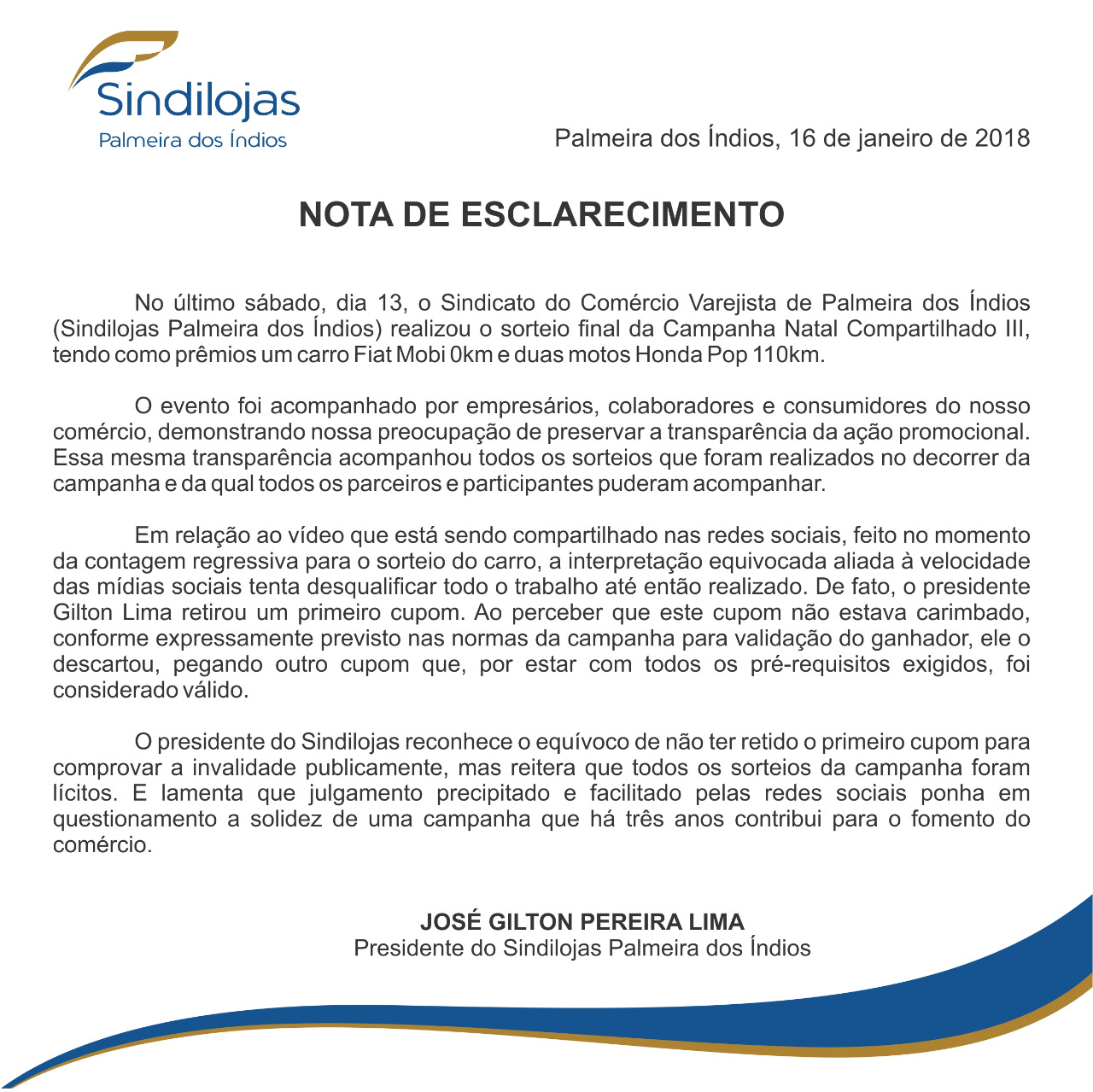 O presidente do Sindicato do Comércio Varejista de Palmeira dos Índios- Sindilojas-, Gilton Lima, emitiu nota sobre um vídeo que circula nas redes sociais de uma suposta fraude no sorteio da Campanha Natal Compartilhado que ocorreu no último sábado (13), no qual foram sorteados um veículo Fiat Mobi e duas motos Pop 110km.