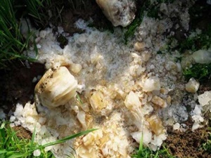Porém, após analisaram o material, especialistas do Departamento Meteorológico da Índiaconcluíram que a massa não era derivada de um fenômeno meteorológico, mas excrementos caídos de um avião e congelados durante a queda.