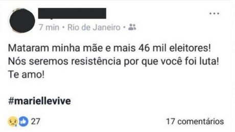 “Mataram a minha mãe e mais 46 mil eleitores! Nós seremos resistência porque você foi luta! Te amo! #mariellevive”, escreveu.