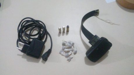 A equipe plantonista chegou ao local e percebeu um homem pulando o muro da uma casa. Após revista neste imóvel, foram apreendidas três munições de revólver calibre 38, seis bombinhas de maconha, uma tornozeleira eletrônica de monitoramento rompida e sua fonte de alimentação.