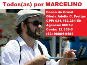 Para os que desejarem contribuir com doações em dinheiro, os dados bancários para depósito divulgados pela campanha “Todos (a) por Marcelino”são os seguintes: Banco do Brasil/Glória Adélia C.Freitas/CPF: 031.462.284-59/Agência: 0007-8/Conta: 12.359-5.