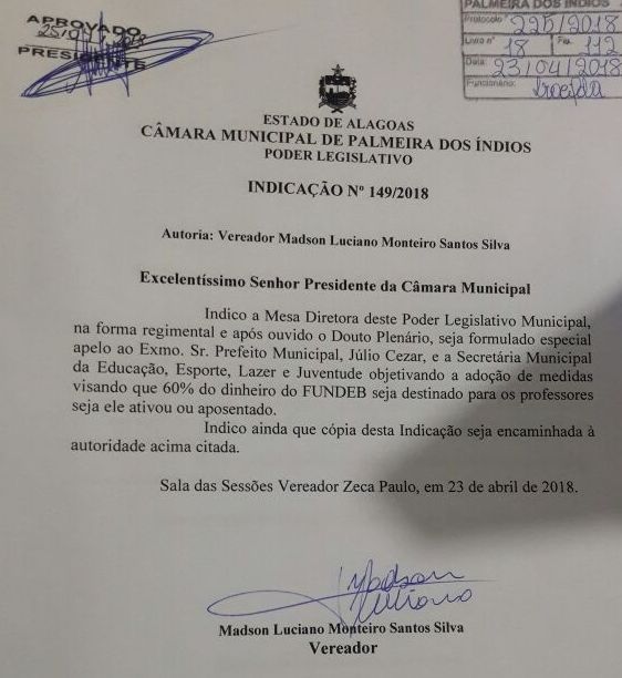 Vereador apresenta indicação de pagamento dos precatórios do FUNDEB aos professores de Palmeira dos Índios