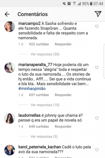 “Cadê o luto pela avó da sua namorada?”, questionou uma jovem. “A Sasha sofrendo e ele fazendo snap. Quanta sensibilidade e falta de respeito”, opinou outra. “Antes, quando o nosso vizinho falecia, ficávamos de luto. Hoje a avó da namorada morre e a galera vai para show zoar com os amigos. Deus é maior. Parece que não tem consideração”, completou.