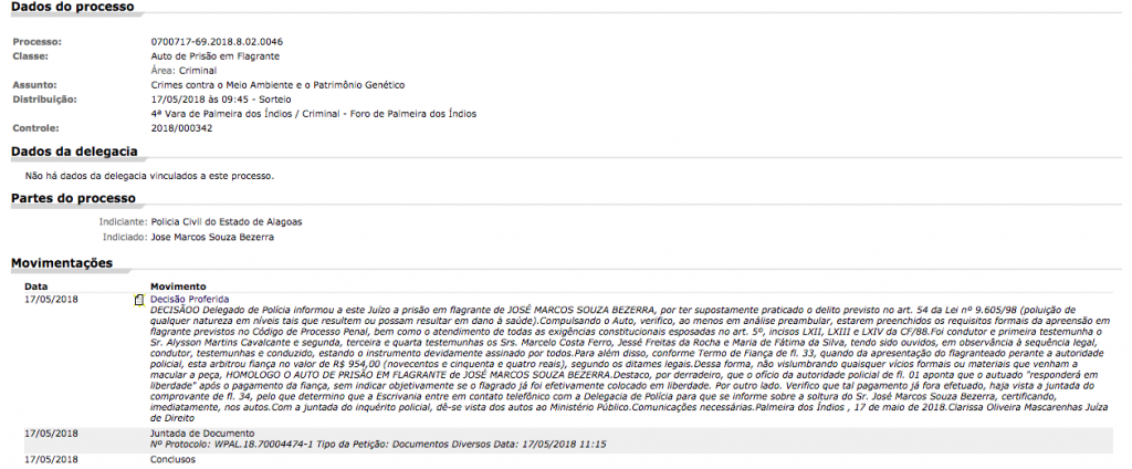 Na decisão do processo, fica detalhado que o delegado de polícia informou  a prisão em flagrante de JOSÉ MARCOS SOUZA BEZERRA, por ter supostamente praticado o delito previsto no art. 54 da Lei nº 9.605/98 (poluição de qualquer natureza em níveis tais que resultem ou possam resultar em dano à saúde). Foi condutor e primeira testemunha o Sr. Alysson Martins Cavalcante e segunda, terceira e quarta testemunhas os Srs. Marcelo Costa Ferro, Jessé Freitas da Rocha e Maria de Fátima da Silva, tendo sido ouvidos, em observância à sequência legal, condutor, testemunhas e conduzido, estando o instrumento devidamente assinado por todos.Para além disso, conforme Termo de Fiança de fl. 33, quando da apresentação do flagranteado perante a autoridade policial, esta arbitrou fiança no valor de R$ 954,00 (novecentos e cinquenta e quatro reais), segundo os ditames legais.