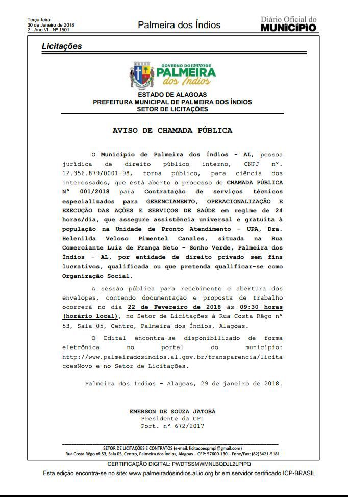 A Prefeitura Municipal de Palmeira dos Índios, emitiu notificação ao Instituto Pernambucano de Assistência e Saúde (IPAS), que gerencia a Unidade de Pronto Atendimento (UPA), comunicando a rescisão definitiva com a Organização Social (OS), publicado no Diário Oficial do Município, na última terça-feira (15). (VEJA NOTIFICAÇÃO COMPLETA)
