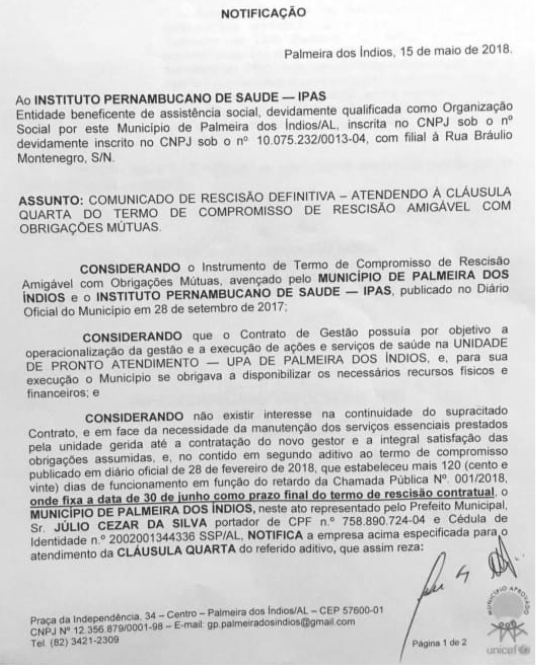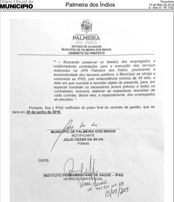 A Prefeitura Municipal de Palmeira dos Índios, emitiu notificação ao Instituto Pernambucano de Assistência e Saúde (IPAS), que gerencia a Unidade de Pronto Atendimento (UPA), comunicando a rescisão definitiva com a Organização Social (OS), publicado no Diário Oficial do Município, na última terça-feira (15). (VEJA NOTIFICAÇÃO COMPLETA)