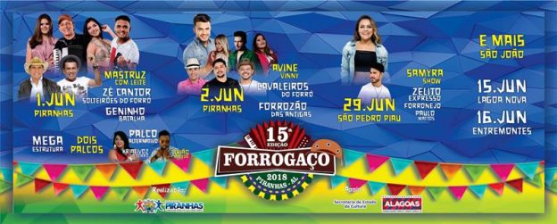 Na histórica cidade de Piranhas/AL, a expectativa agora reina em torno da chegada do Forrogaço 2018, evento já consagrado no calendário turístico do sertão alagoano, que este ano entra para a sua 15ª edição. A festa acontece na sexta e no sábado da outra semana; e no domingo será a vez do aniversário da cidade que entra para seus 131 anos. A prefeita Maristela Dias afirma que ganhou apoio do governo alagoano, a fim de garantir um colorido maior durante esse período festivo. Além de uma vasta programação cultural e esportiva, a festa terá como grandes atrações musicais, as bandas: Matruz com Leite, Cavaleiros do Forró, Forrozão das Antigas e Avine Vinny, entre outras.