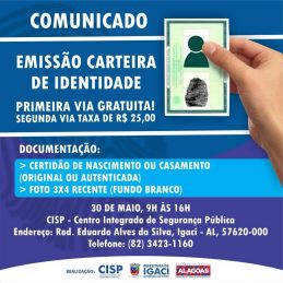 A Prefeitura Municipal de Igaci em parceira com o Governo do Estado informa que os interessados na emissão de carteira de identidade.