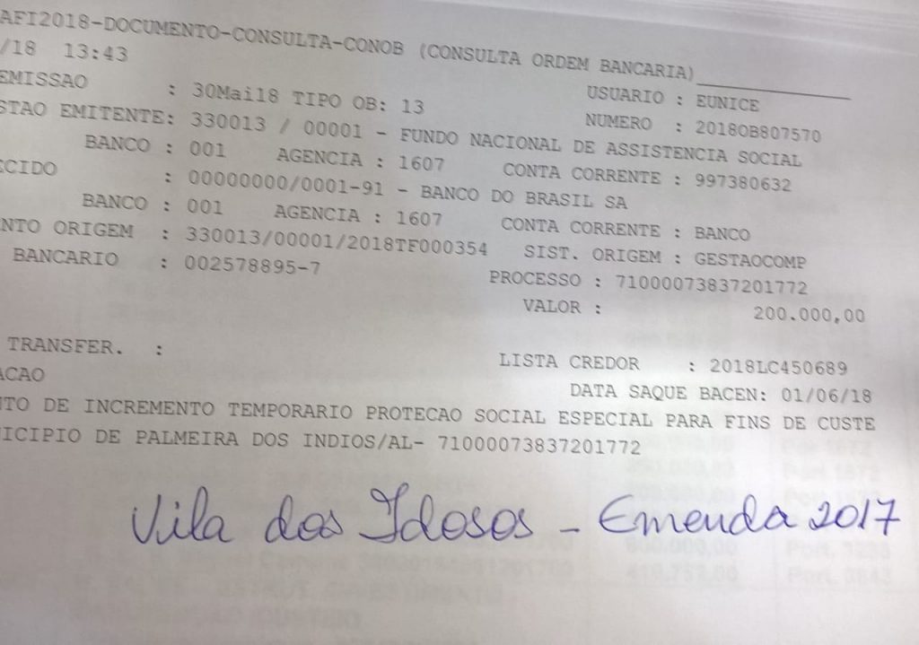 O valor deve ser utilizado para o custeio de alimentação, fraldas, roupas e despesas. A destinação do recurso, fruto da emenda parlamentar, chegará à Vila do Idoso através da Prefeitura Municipal de Palmeira dos Índios.