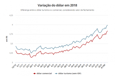 Em casas de câmbio consultadas pelo G1, já acrescido do imposto sobre operações financeiras (IOF), o dólar já é negociado entre R$ 4,08 e R$ 4,16. No cartão pré-pago, os valores variam entre R$ 4,30 e R$ 4,35.