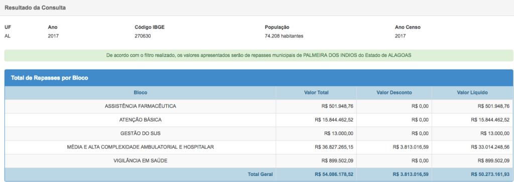 Conforme os repasses do Fundo Nacional de Saúde, o valor líquido dividido em blocos repassado à Palmeira dos Índios foi de R$ 50. 273,161,93 (Cinquenta milhões, duzentos e setenta e três mil, cento e sessenta e um reais e noventa e três centavos), somente em 2017.