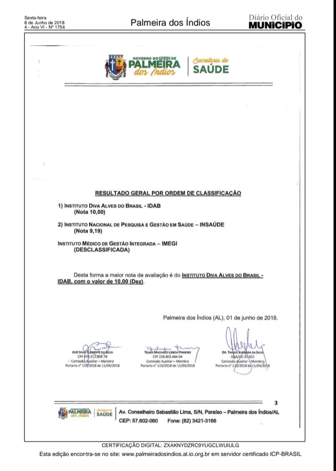 Também participaram da licitação, o Instituto Médico de Gestão Integrada – IMEGI e Instituto Nacional de Pesquisa e Gestão em Saúde – INSAÚDE que foram desclassificados.