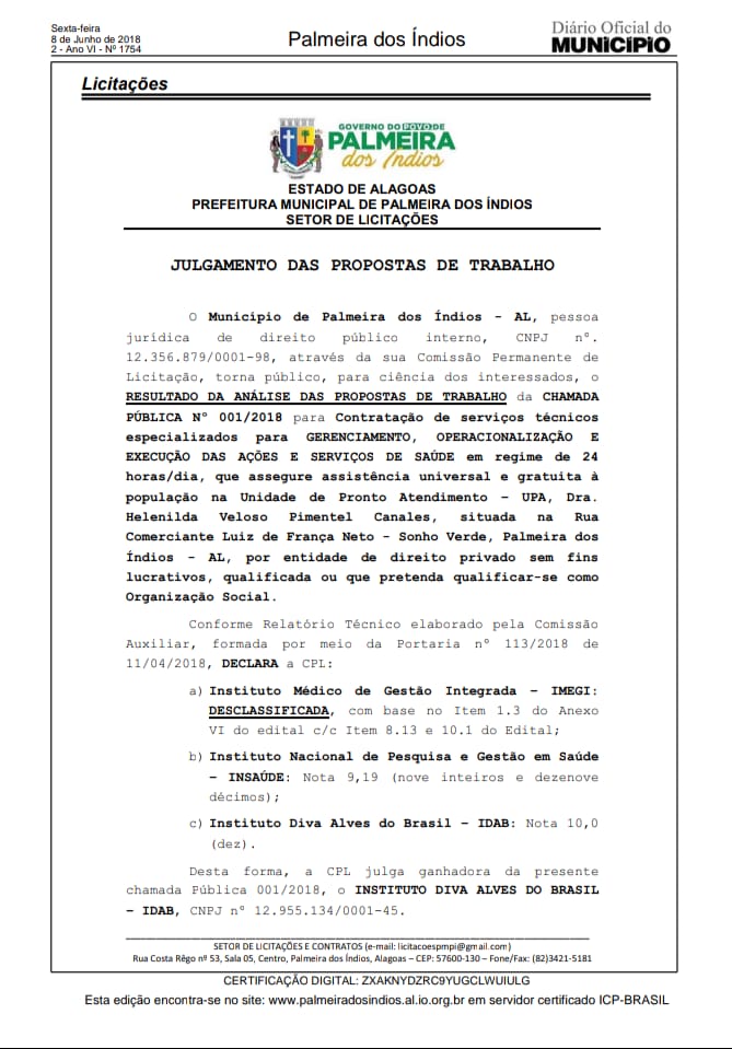 A Prefeitura Municipal de Palmeira dos Índios divulgou o resultado da análise das propostas de trabalho da Chamada Pública Nº 001/2018, contendo o nome da nova empresa vencedora para gerenciamento, operacionalização e execução das ações e serviços de saúde em regime de 24 h, que assegure assistência universal e gratuita à população na Unidade de Pronto Atendimento – UPA, Dra. Helenilda Veloso Pimentel Canales.