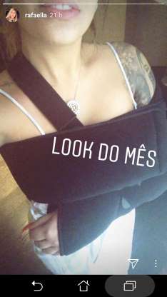 Rafaella Santos surgiu com o braço imobilizado em uma foto compartilhada em seu Instagram Stories, neste domingo (24). “Look do mês”, escreveu a irmã de Neymar, que está na Rússia para prestigiar o irmã na Copa do Mundo. No registro, é possível ver que a tipoia envolve todo o braço esquerdo e o tronco da jovem, que foi elogiada pela mãe ao lado de Bruna Marquezine antes do jogo do Brasil contra a Costa Rica na sexta-feira (22). Rafaella não deu mais detalhes do ocorrido.
