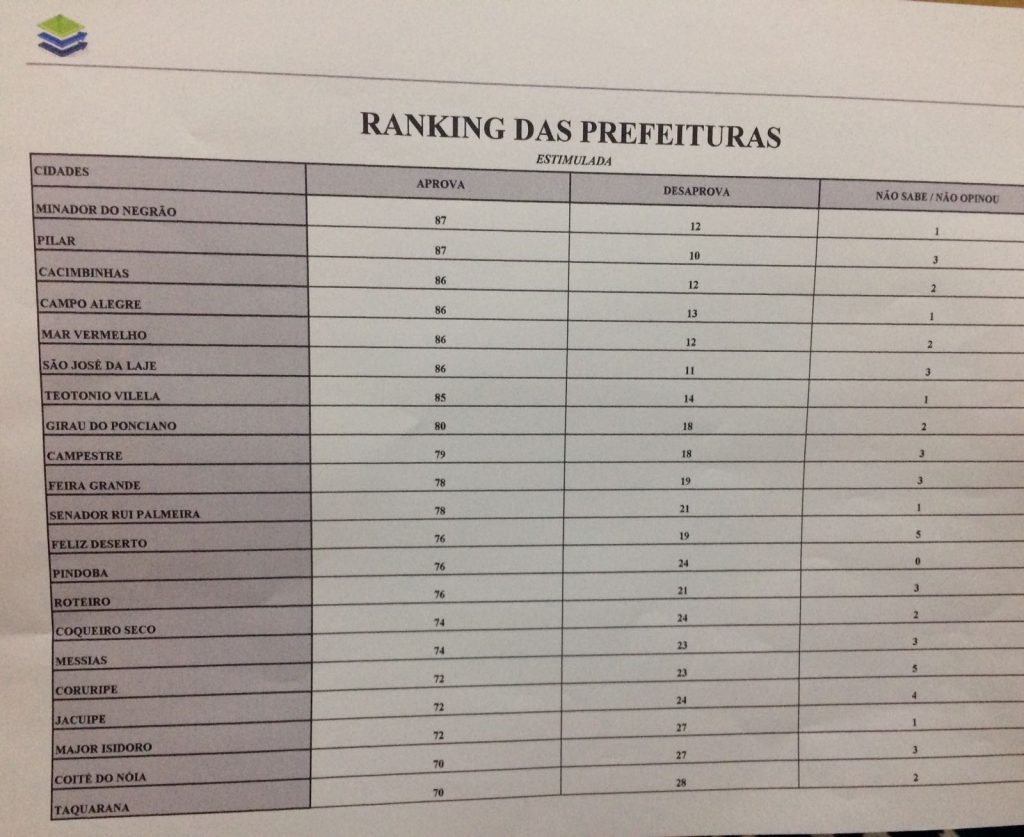 Uma pesquisa inédita realizada pelo Instituto Brasileiro de Pesquisa (Ibrape) nos 102 municípios alagoanos, divulgada pelo site Cada Minuto, aponta que o município de Minador do Negrão, lidera o ranking das prefeituras com maior aprovação popular, com 87%.