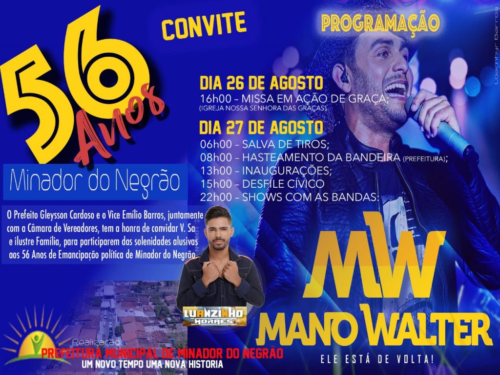 A Prefeitura Municipal de Minador do Negrão, comemorará 56 anos de conquista na emancipação política administrativa, nesta segunda-feira (27). Para celebrar a data, o prefeito Gleysson Cardoso (MDB) e sua equipe organizam um grande evento festivo.