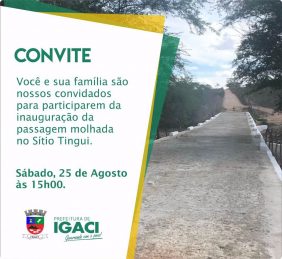 Neste sábado (25), a partir das 15h, o prefeito Oliveiro Torres Piancó (MDB), participa ao lado de secretários e colaboradores, da inauguração da passagem molhada do sítio Tingui, na zona rural de Igaci.
