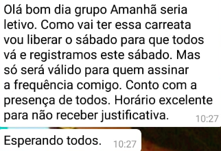 Tivemos acesso a um dos avisos “curtos e grossos”  divulgado em um grupo de whatsApp por Marluce Nunes, diretora da creche municipal Maria do Carmo Sampaio Caparica, -localizada na Vila Maria-, uma espécie de intimação para que funcionários participem das atividades realizadas em pleno sábado (22), data da carreata dos candidatos Arthur e Benedito de Lira.